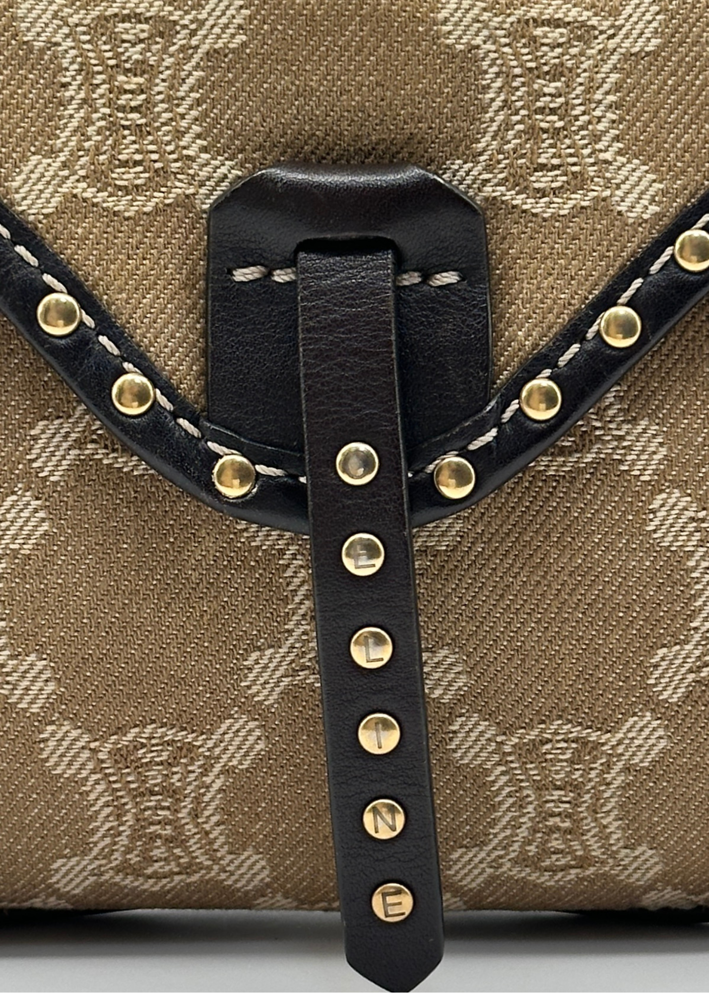 Gold-toned hardware throughout; CELINE logo engraved studs on bag closure and Celine triomphe logos engraved on hardware
