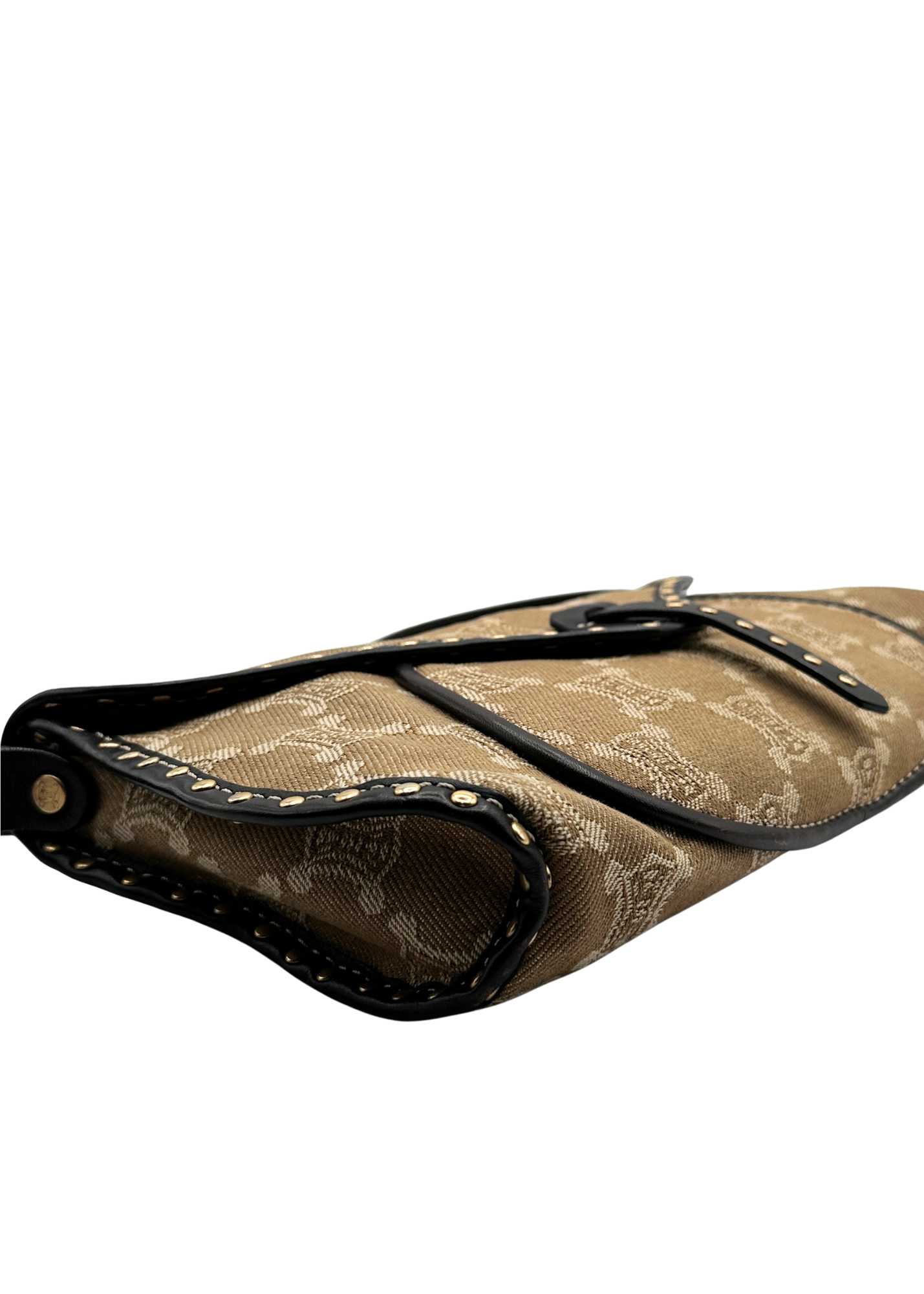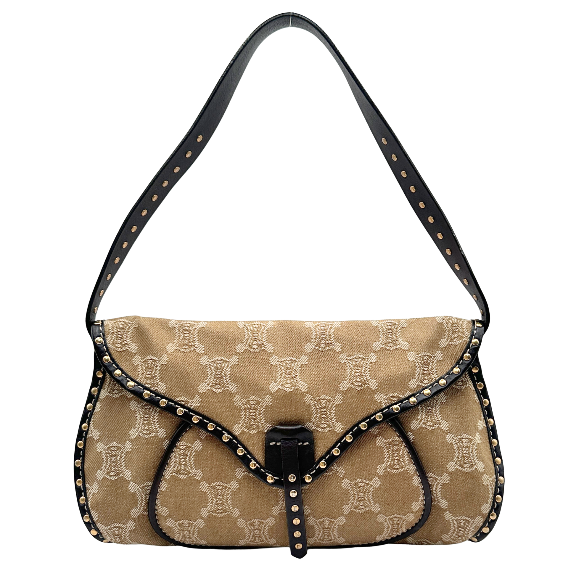 Celine vintage triomphe shoulder bag in hard-to-find tan triomphe embroidered denim.