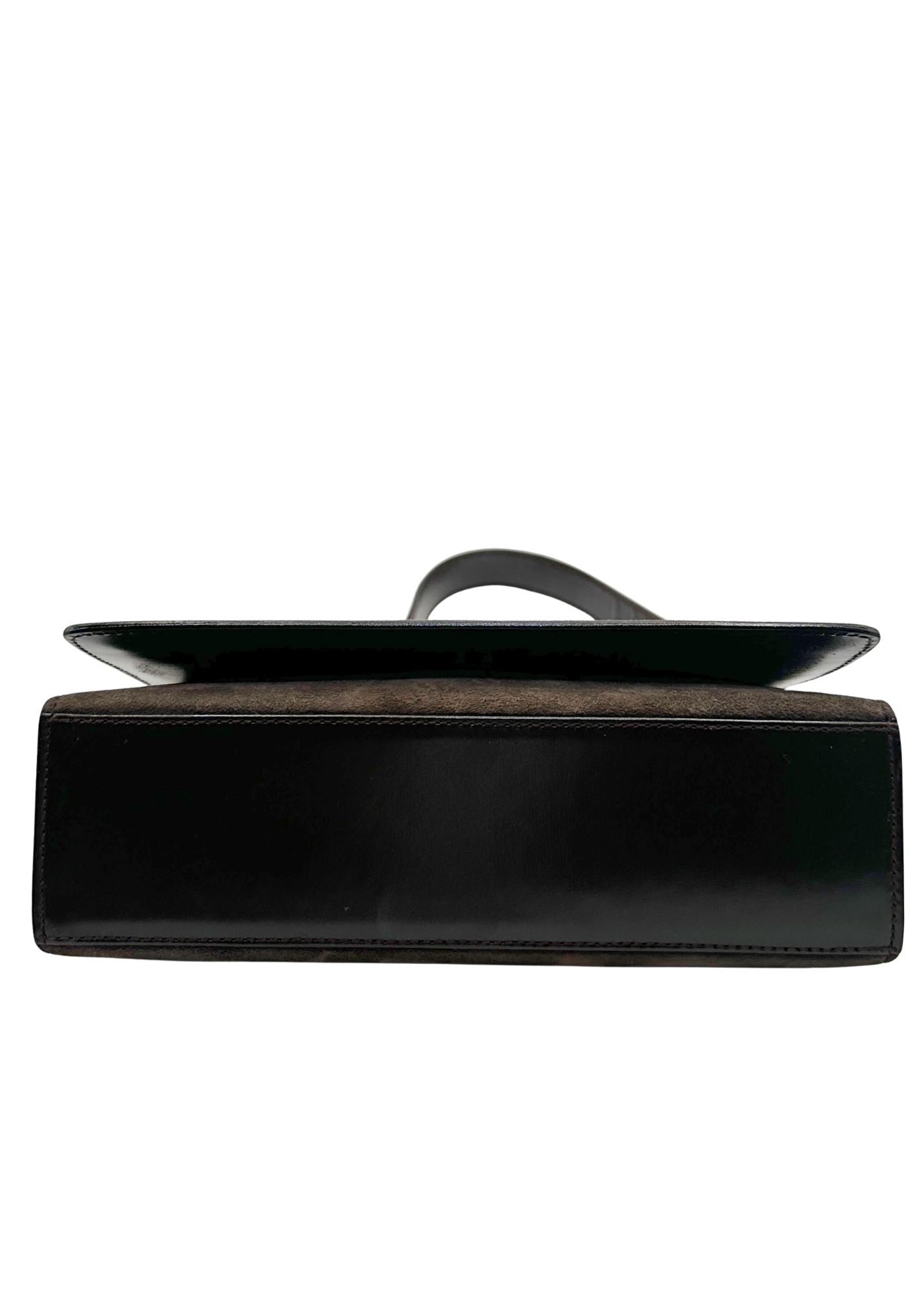 Mocha brown suede triangle body and shoulder strap with brown leather base