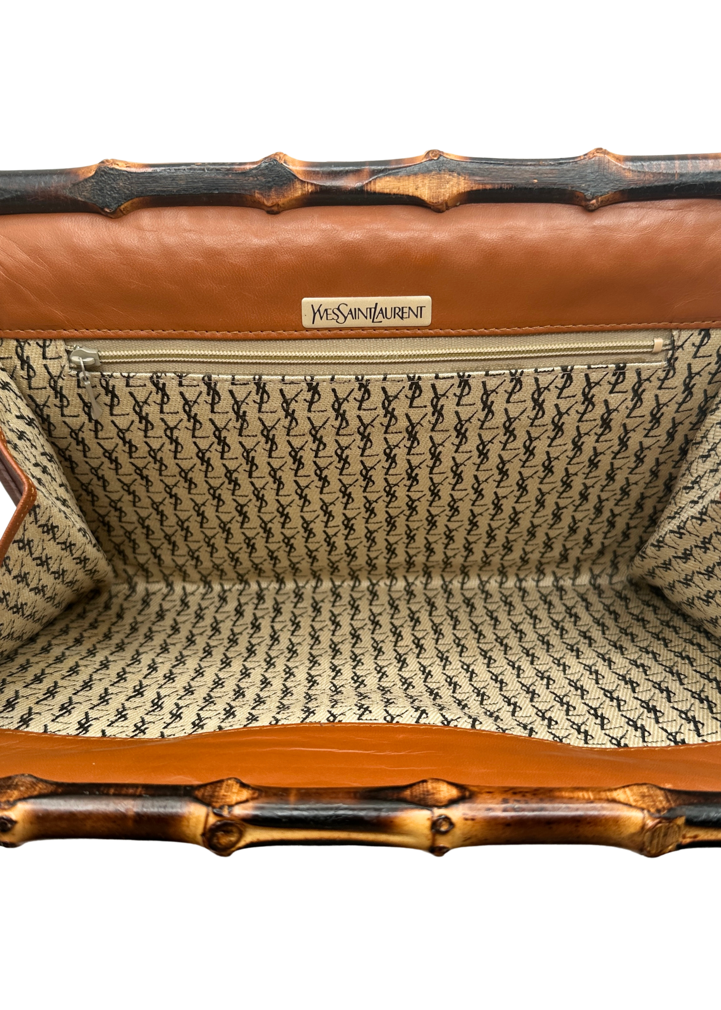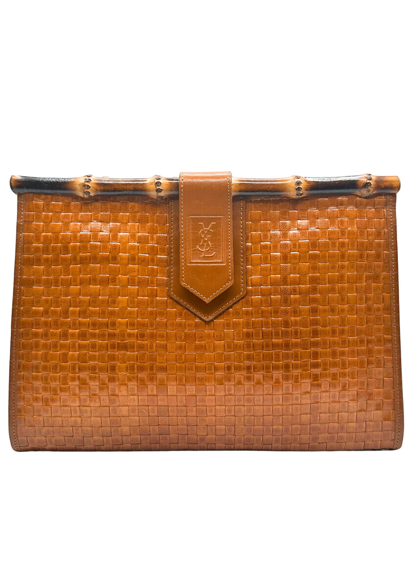 A limited edition and rare vintage cognac woven leather clutch with bamboo trim from Yves Saint Laurent. Circa 1980's.